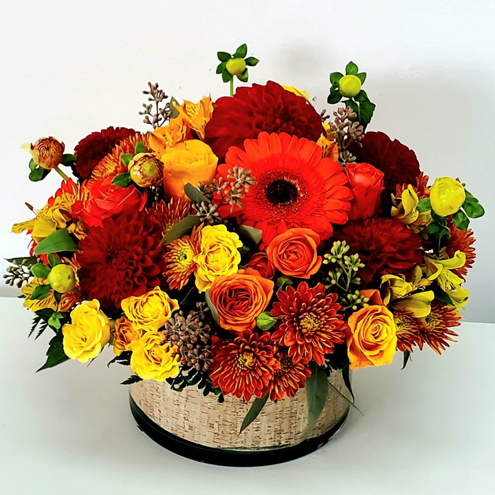 Sunlit Bliss is a bold, earth-toned compact arrangement designed to brighten any space with its warm, natural hues. This striking bouquet combines rich textures and subtle shades, creating a daring yet harmonious display that brings a confident smile to your day.