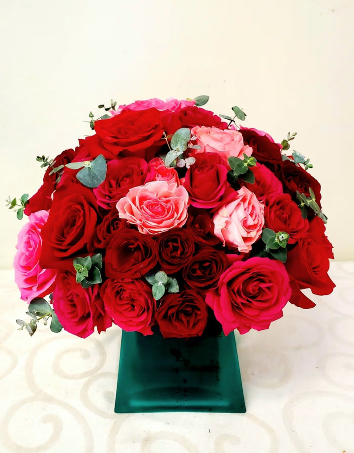 An elegant bouquet of multicolor roses and spray roses arranged in a low colored glass vase accented with eucalyptus leaves. Dazzle her with the beauty and elegance of this bouquet.