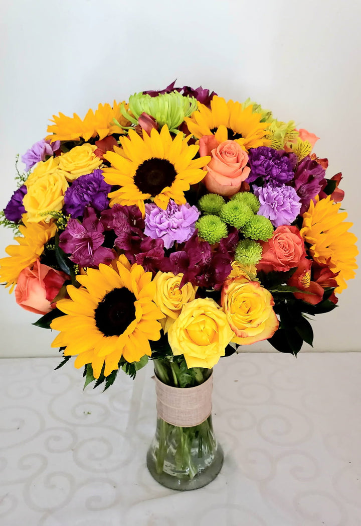Cheer someone up with this Fresh and colorful bouquet of sunflowers, designed with her in mind in a tall vase accented with a natural ribbon. The combination of orange, purples, yellow, magenta and greens will surely brighten the day.