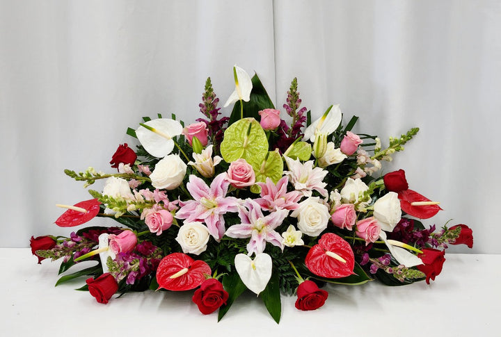 This arrangement is thoughtfully designed to express heartfelt sympathy and honor cherished memories.