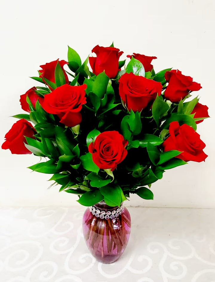 The essence of beautiful Red Roses always brings love to life. Designed in a bejeweled pink vase and accented with exotic greens, this gift is sure to make her smile.