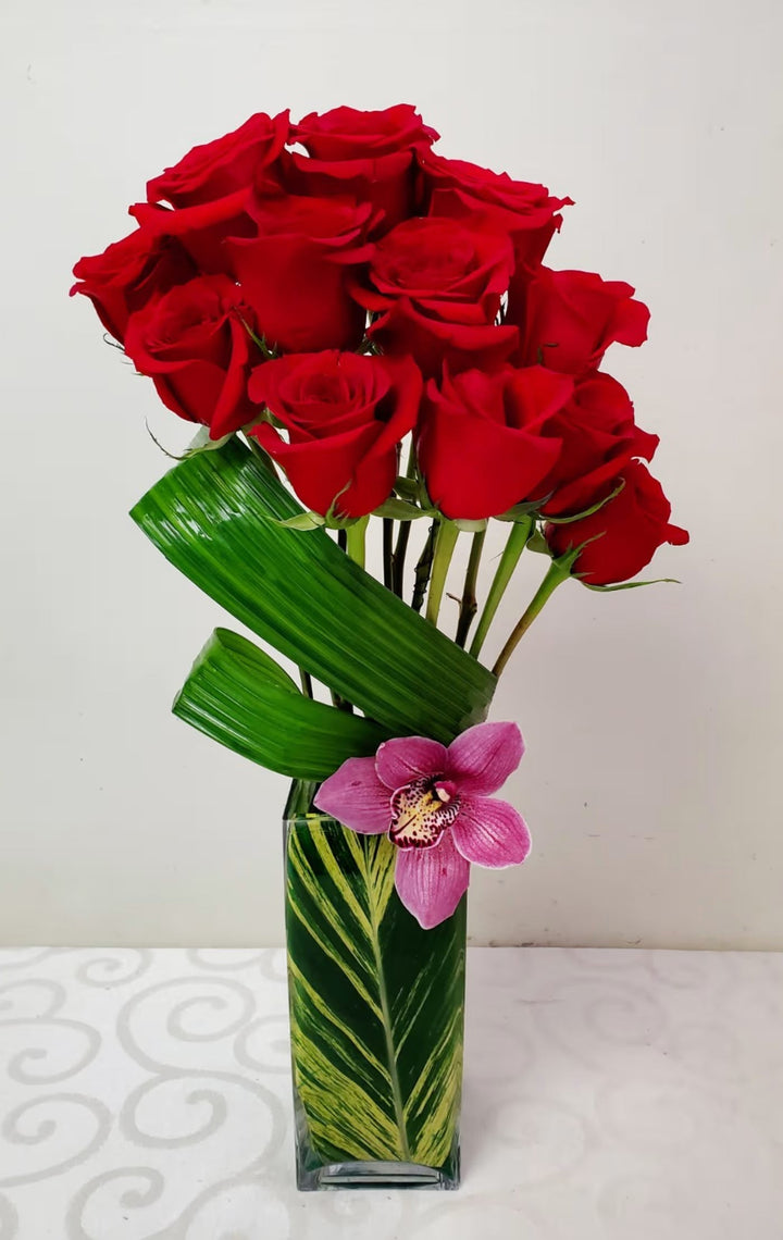 Luxurious Dozen Red Roses designed in a tall glass vase lined with exotic Ginger and ti leaves. Simple yet elegant. Send this to your loved one and make them feel loved.