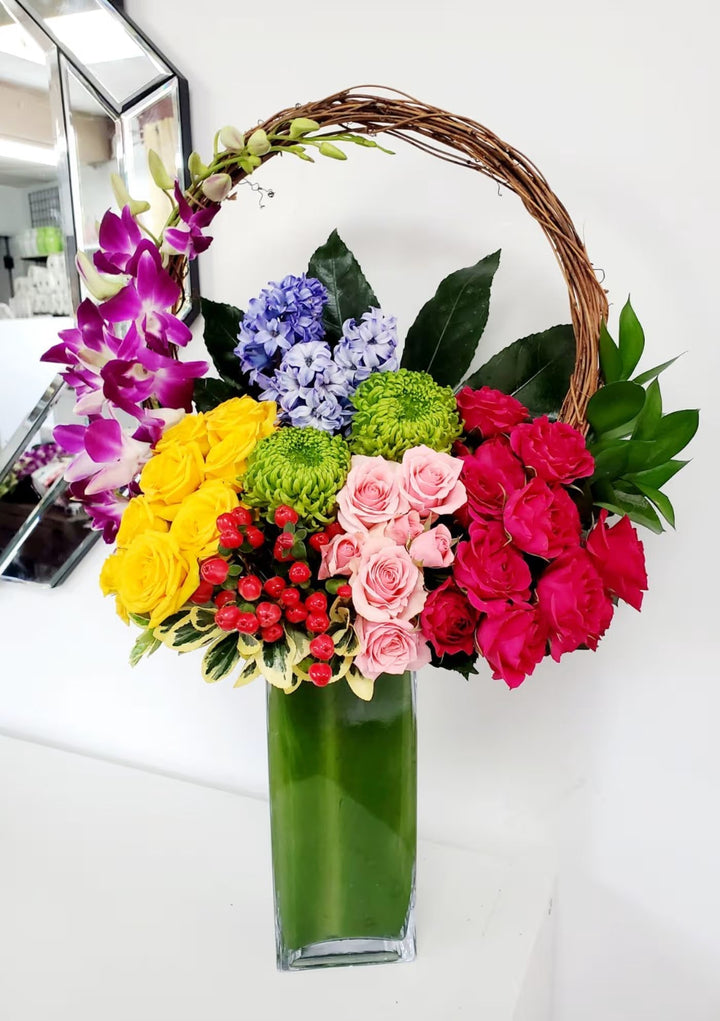 Bring that smile out with this expertly curated fusion of colorful blooms of roses accented by dendrobium orchids and delicate blue hyacinth exquisitely designed with circular birch branches creating a unique contemporary and sophisticated floral masterpiece.