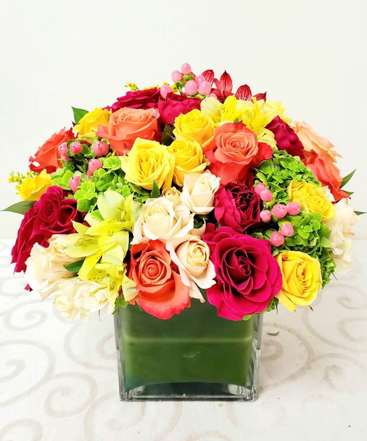 Designed in a cube vase lined with Ti Leaf, Marmalade exudes elegance and joy. The combination of colorful spray roses makes this contemporary bouquet beautiful and unique.