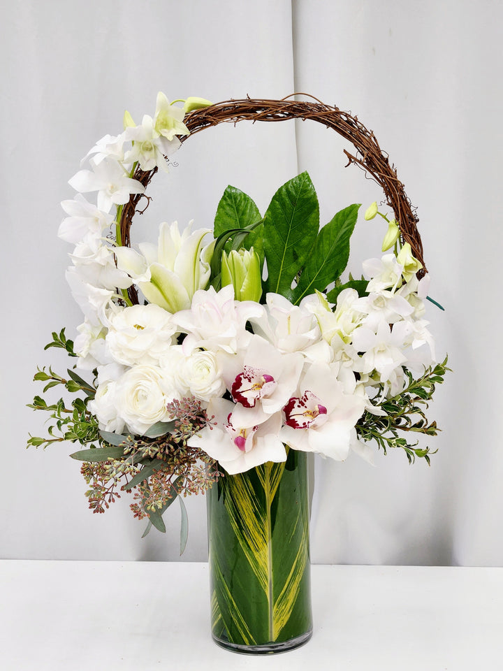 Pure Intentions showcases a stunning blend of white orchids and lilies, thoughtfully arranged with a unique arch of dried twigs. This custom design radiates pure elegance and sophistication, making it a one-of-a-kind statement piece perfect for any special occasion. Elevate your space with this exquisite floral arrangement crafted just for you.